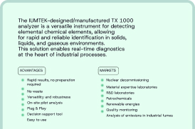 The TX 1000 analyzer is a versatile instrument for detecting elemental chemical components, enabling fast and reliable identification in solid, liquid, and gaseous media. Its compact and fully autonomous format requires no consumables, no acids, and no Argon. Thanks to its inherently green technology, it can be installed in any location without specific requirements (laboratory, production site, office).
